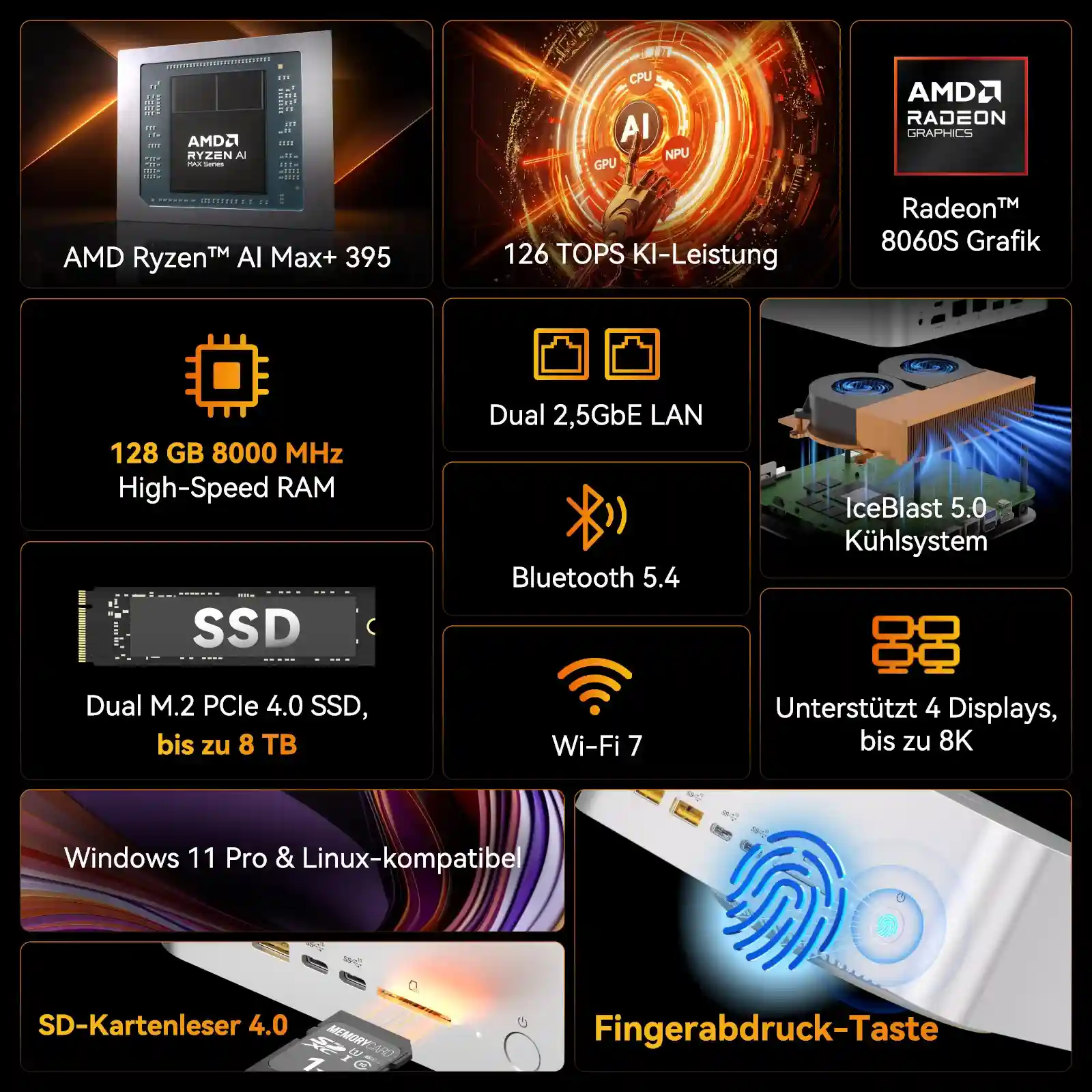 - Bis zu 128GB LPDDR5x & RAID-Speicher – Ultraschneller LPDDR5x-8000 RAM bis zu 128GB sowie Dual M.2 2280 PCIe Gen4x4 SSD (bis zu 8TB) mit RAID 0/1 für extrem schnelle Datenübertragung.