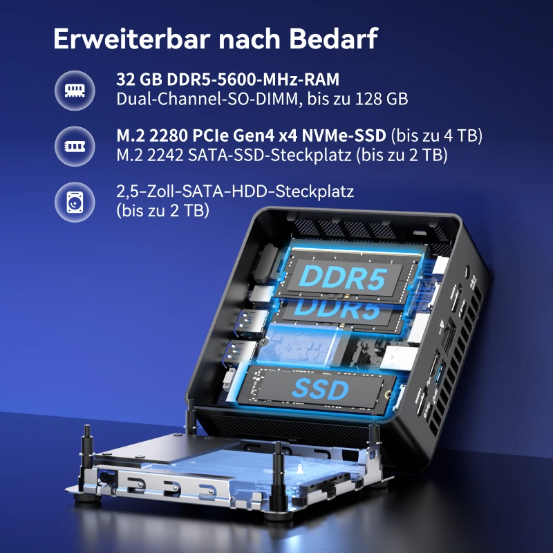 - Unterstützt bis zu 64 GB RAM + 5 TB SSD Speicherkapazität – ausgestattet mit 32 GB Dual-Channel RAM (bis zu 64 GB) und PCIe Gen4 NVMe SSD (bis zu 2 TB), plus freier M.2 2242 SATA-Slot (bis zu 1 TB) und 2,5″-SATA-HDD-Slot (bis zu 2 TB) zur eigenen Erweiterung