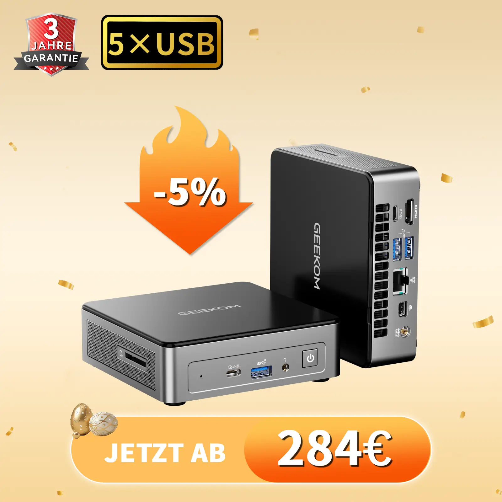 Mit dem GEEKOM Mini Fun9 wird die Gaming-Atmosphäre zum Leben erweckt! Mit seinen fünf USB-Anschlüssen können Sie mehrere coole Zubehörteile anschließen und bis zu drei 4K-Bildschirme für ein unschlagbares Spielerlebnis unterstützen.