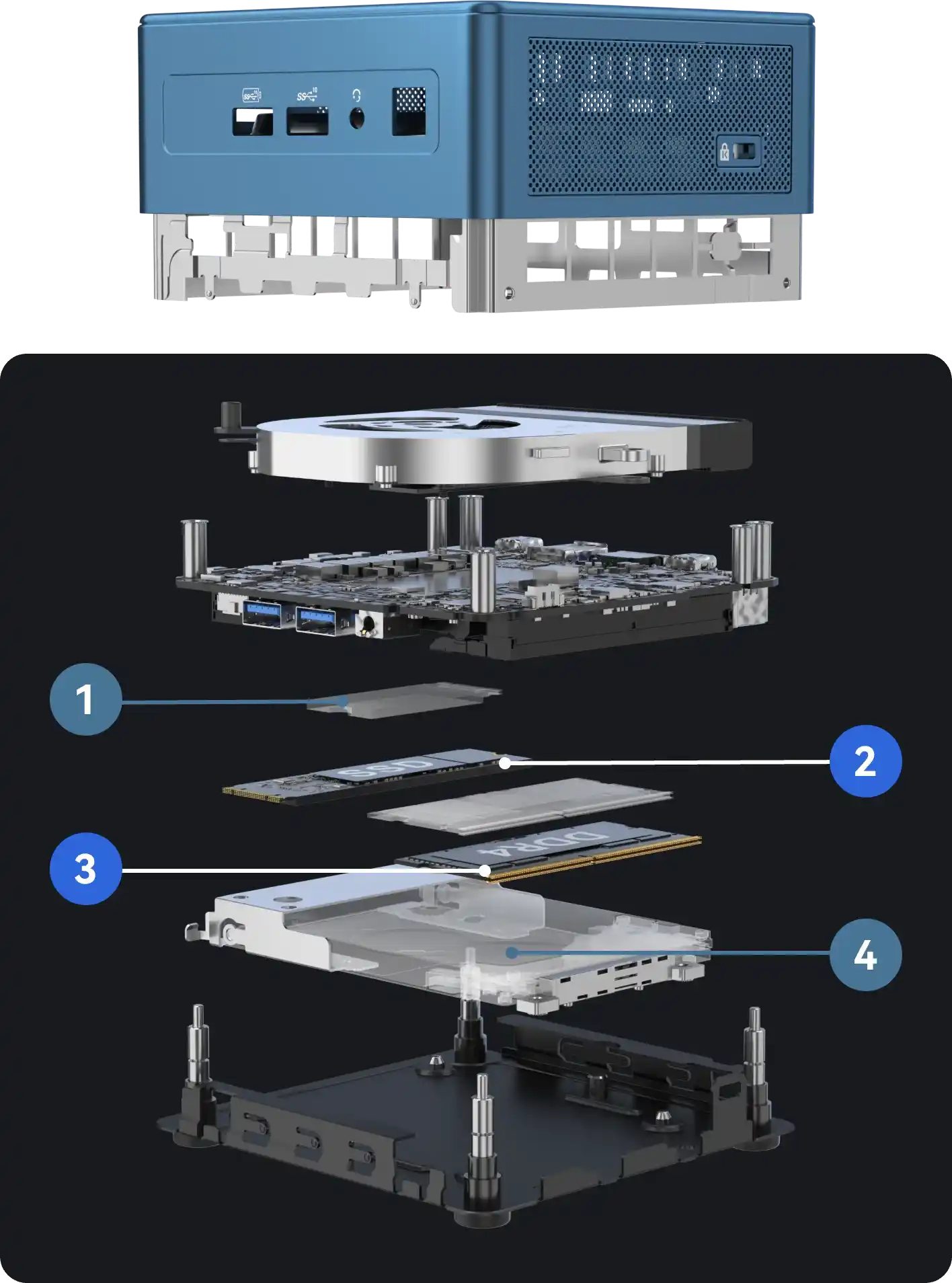 - Unterstützt bis zu 128 GB RAM + 8 TB SSD-Speicherkapazität – ausgestattet mit 32 GB Dual-Channel DDR5-5600 SODIMM (bis zu 128 GB) und M.2 2280 NVMe PCle® Gen4 x4 SSD (bis zu 4 TB), plus freier M.2 2242 SATAlll-Slot (bis zu 2 TB) und 2,5″-SATA-HDD-Slot (bis zu 2 TB) zur eigenen Erweiterung